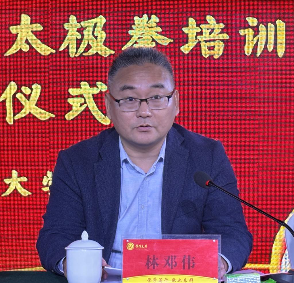 首先,林邓伟发表欢迎词。他介绍了太极武术学院的基本概况、太极拳教学核心优势及专业授课专家团队后,同时强调,作为本次“国培计划”太极拳培训项目的承办单位,我校将以精心筹备、尽心服务的态度,全面统筹培训组织管理、教学实施及后勤保障等关键环节,全力保障此次国家级培训项目圆满落地。